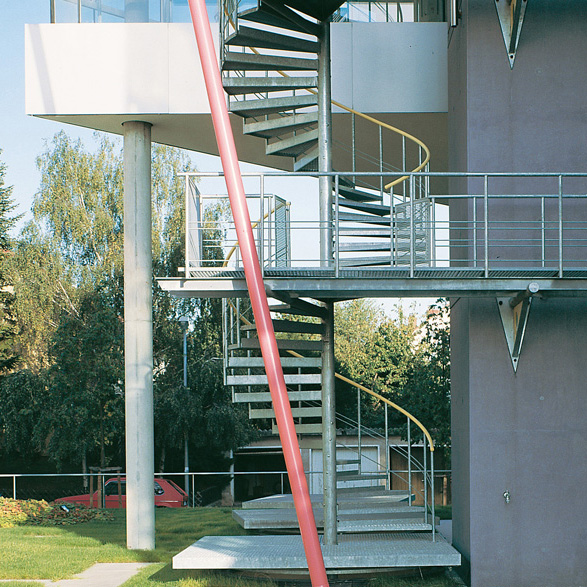 Die Treppengeländer werden in zwei Grundversionen, als Stahlrohrgeländer vorwiegend für den Industriebereich und als Stahlstabgeländer entsprechend den Bauordnungsvorschriften angeboten. Die Rundrohrpfosten besitzen Laschen zur Verschraubung mit jeweils zwei Tritten. Die Geländer werden im Podestbereich des Galeriegeländers fortgeführt.