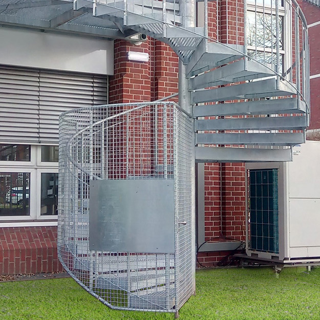 Der Schutzkäfig umfaßt etwa die Hälfte des Treppendurchmessers, bzw. bis eine Abdeckung der Stufen in einer Höhe von ca.2,2m erreicht wird. Die Fluchttüre befindet sich unmittelbar am Treppenaustritt. Größere Bauhöhen sind möglich. Als Füllungen sind senkrechte Stäbe, Welldrahtgitter, Lochblech oder Gitterroste einsetzbar.