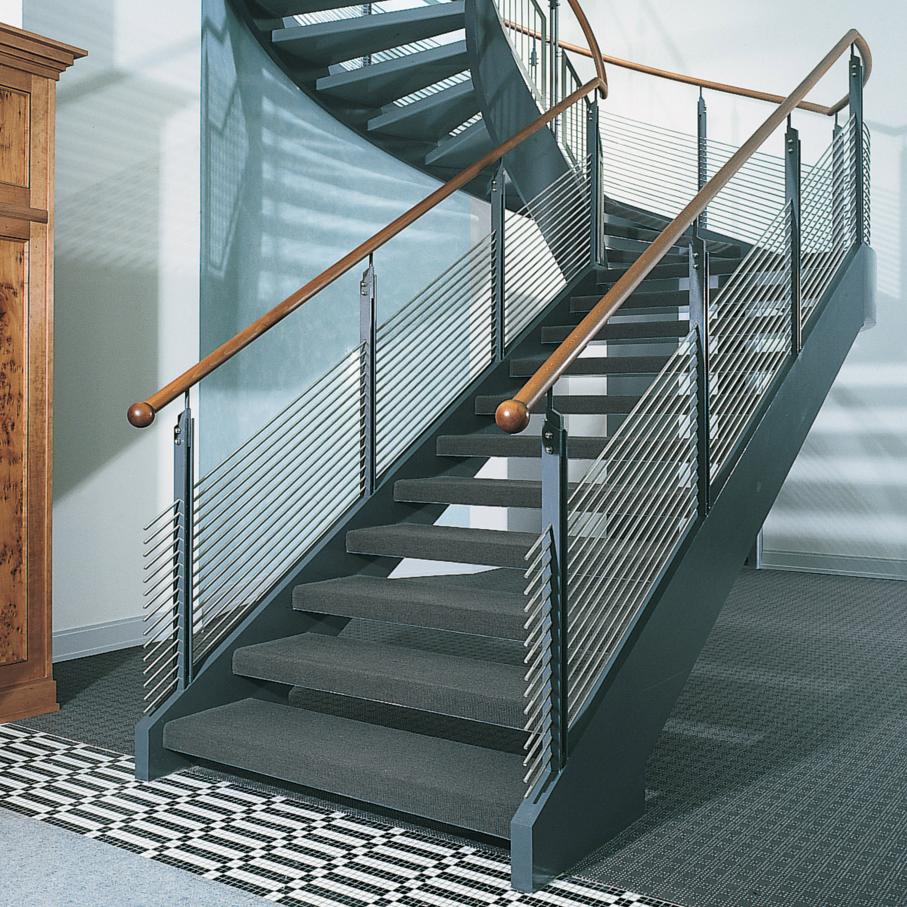 Treppen mit zusätzlicher statischer Abhängung. Ausführung mit trittverdeckenden Flachstahlaußenwangen mit eingeschweißten versenkten Faltwerkstufen aus Stahlblech. Teppichbelag eingeklebt. Dazu beidseitig ein Stahlstabgeländer mit senkrechten Füllstäben aus Flachstahl zwischen Ober- und Untergurt aus Flachstahl. Edelstahl-Rohrhandläufe auf Konsolen an den Geländerinnenseiten.
