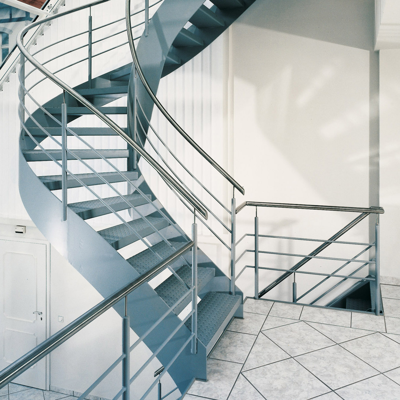 Stahlhandläufe aus Stahlrohr, Flachstahl oder als Stahlkasten. Bei gebogenen Treppengrundrissen kalt verformt.