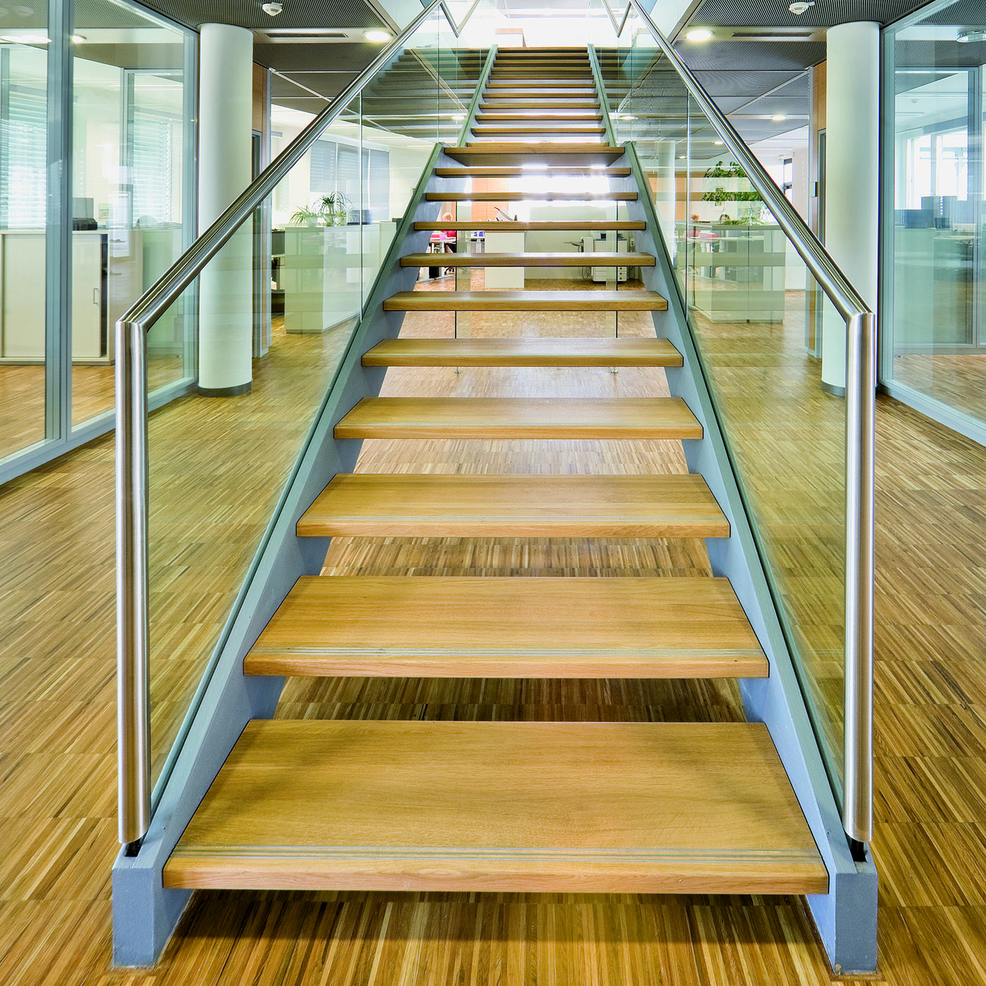 Zweiwangen-Stahltreppe als gerade Treppe über zwei Geschosse mit Zwischenpodesten als Halbpodeste. Zwischen den Wangen verschweißte Stahlblechfaltstufen mit Holztrittbelag aus Eiche mit 2 Rutschsicherheitskanten aus PVC.