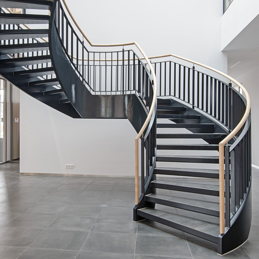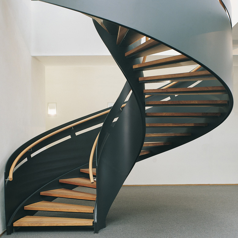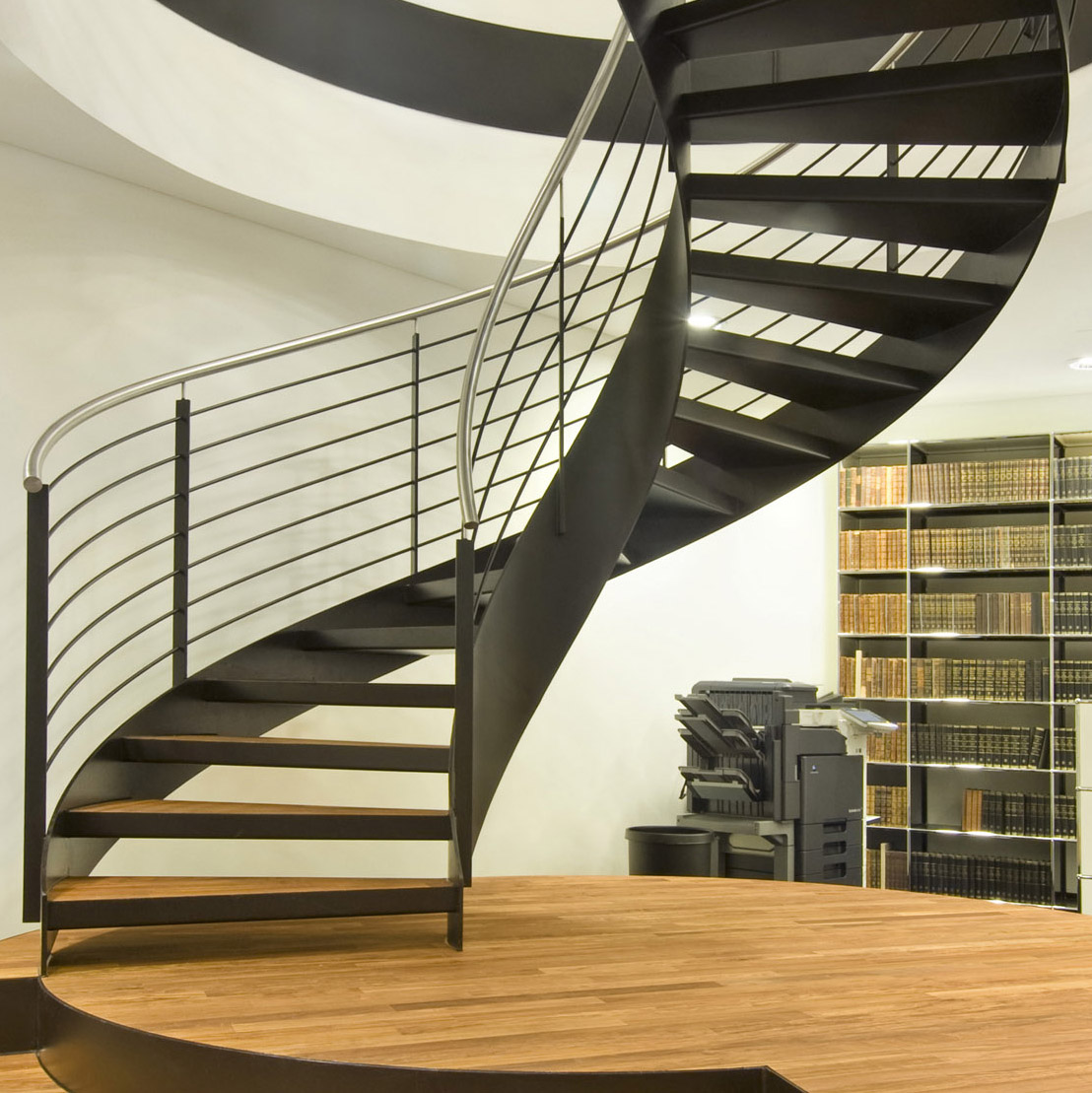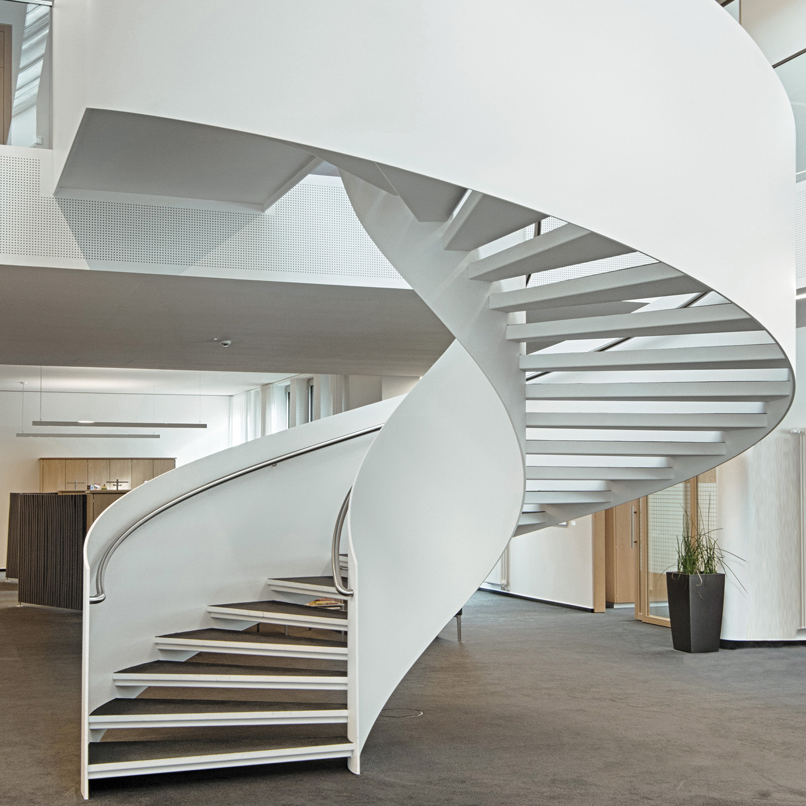 Zweiwangen-Stahltreppe mit gleichmäßig gewendeltem Grundriss über drei Geschoße mit Austritts- und Zwischenpodesten jeweils an eine Galerie. Ausführung mit geländerhohen geschlossenen Brüstungen aus Stahlblech und eingeschweißten Stahlblechfaltstufen. Belag aus Eichestufen mit Setzstufen und einer Stufenbeleuchtung. Verkleidung der Treppenuntersicht mit einem Holzfaltwerk aus Eiche. Dazu ein runder Holzhandlauf aus Eiche auf Konsolen. Geländer am Deckenrand fortgeführt und als Deckenzarge verlängert. Stahlteile lackiert, Holzteile geölt.