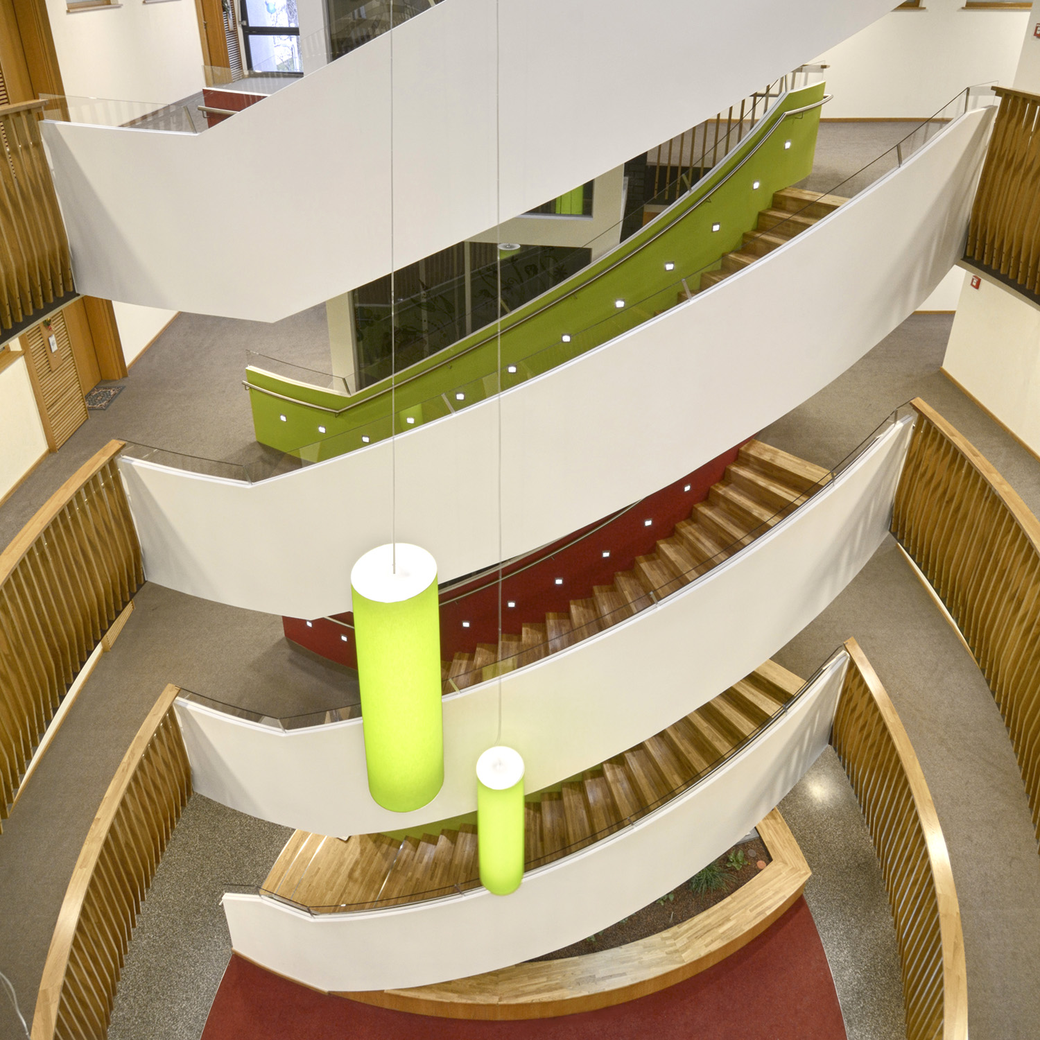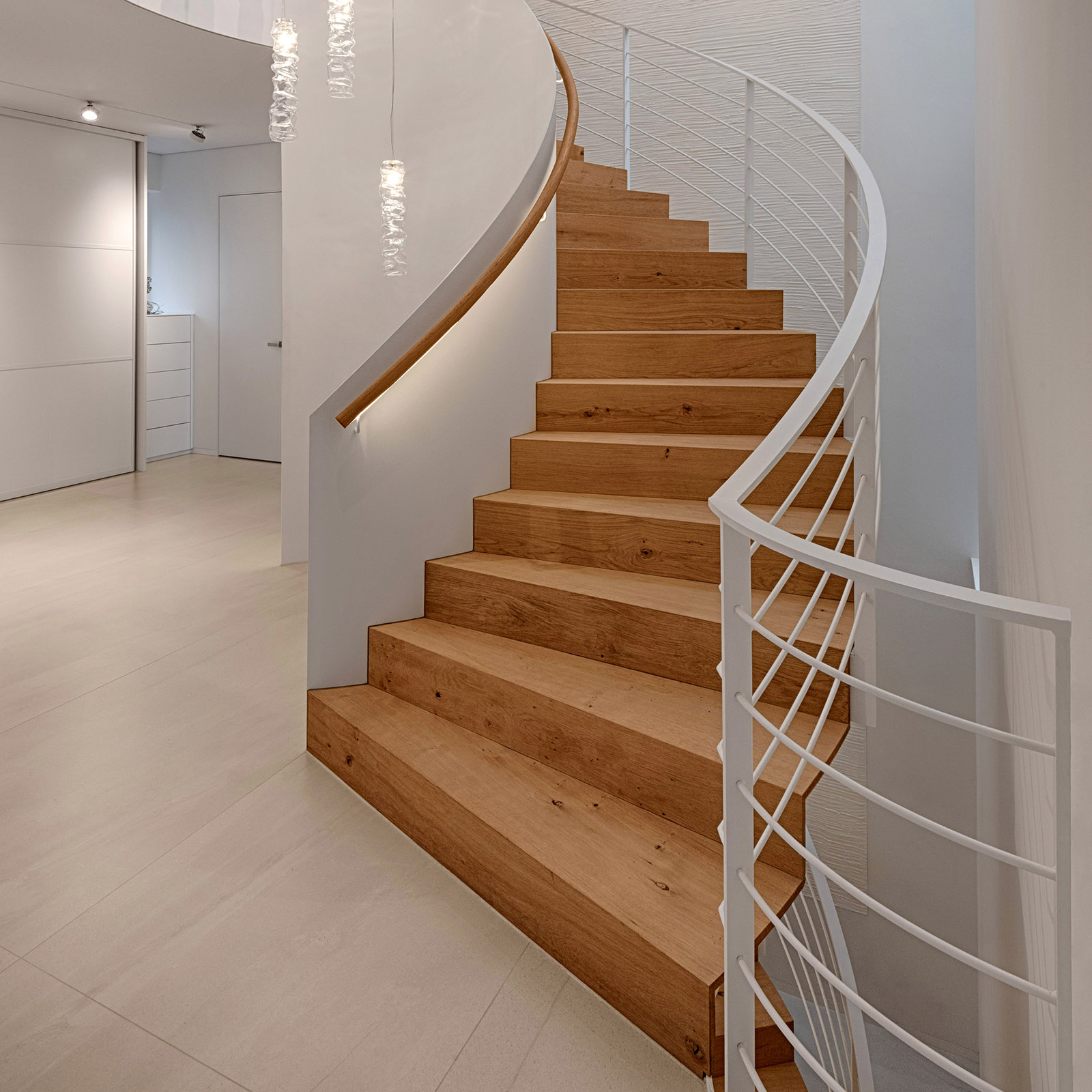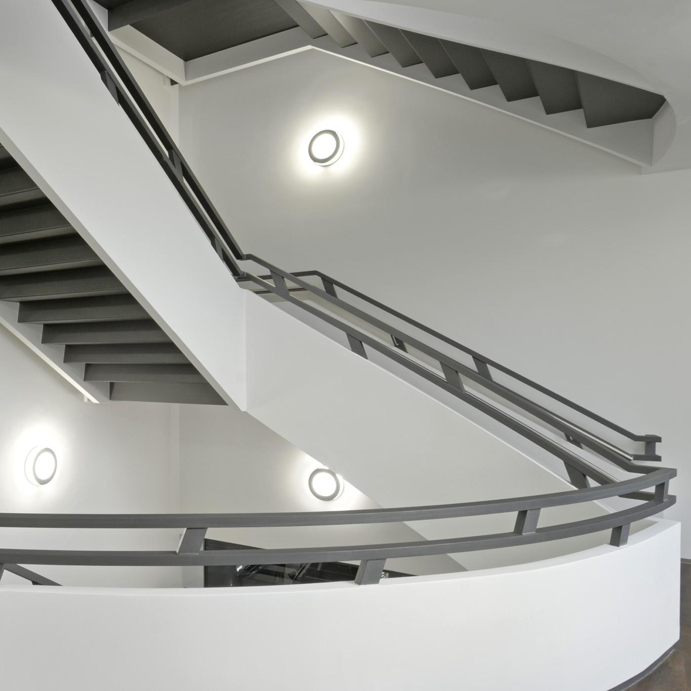 Zweiwangen-Stahltreppe mit gleichmäßig gewendeltem Grundriss über drei Geschoße mit Austritts- und Zwischenpodesten jeweils an eine Galerie. Ausführung mit geländerhohen geschlossenen Brüstungen aus Stahlblech und eingeschweißten Stahlblechfaltstufen. Belag aus Eichestufen mit Setzstufen und einer Stufenbeleuchtung. Verkleidung der Treppenuntersicht mit einem Holzfaltwerk aus Eiche. Dazu ein runder Holzhandlauf aus Eiche auf Konsolen. Geländer am Deckenrand fortgeführt und als Deckenzarge verlängert. Stahlteile lackiert, Holzteile geölt.