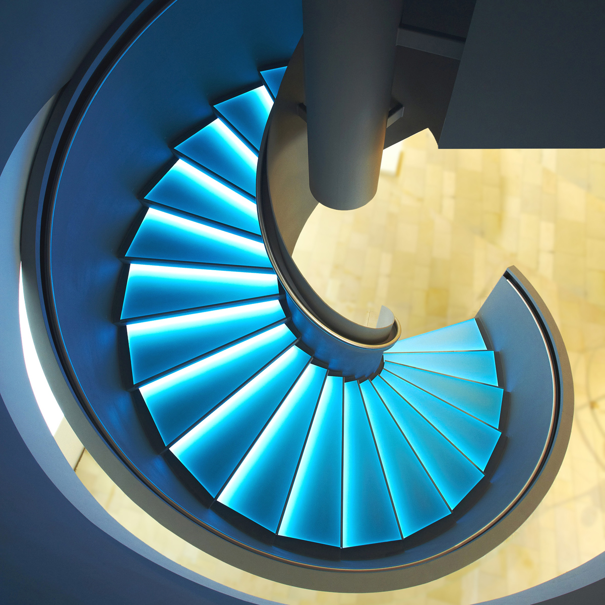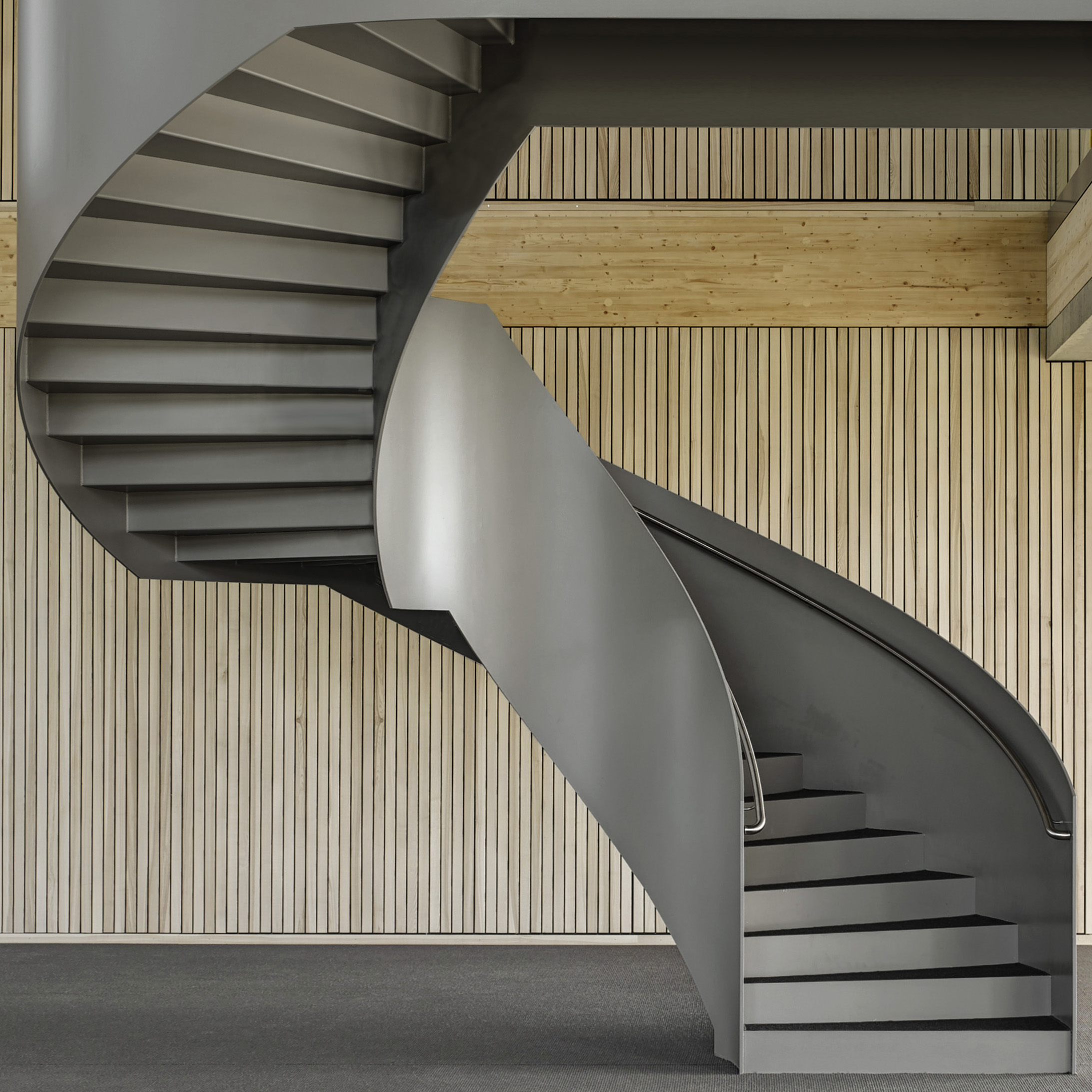 Zwei Zweiwangen-Stahltreppen mit gegenläufig gewendelten Grundrissen.