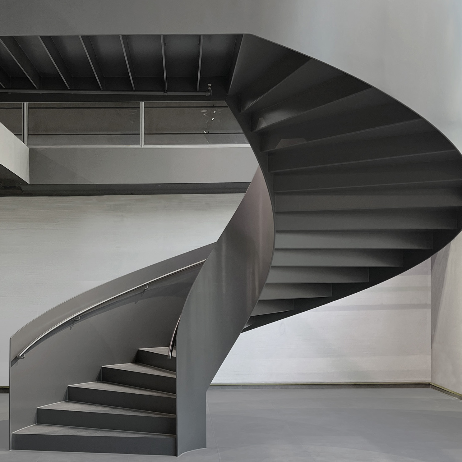 Zweiwangen-Stahltreppe mit gleichmäßig gewendeltem Grundriß.