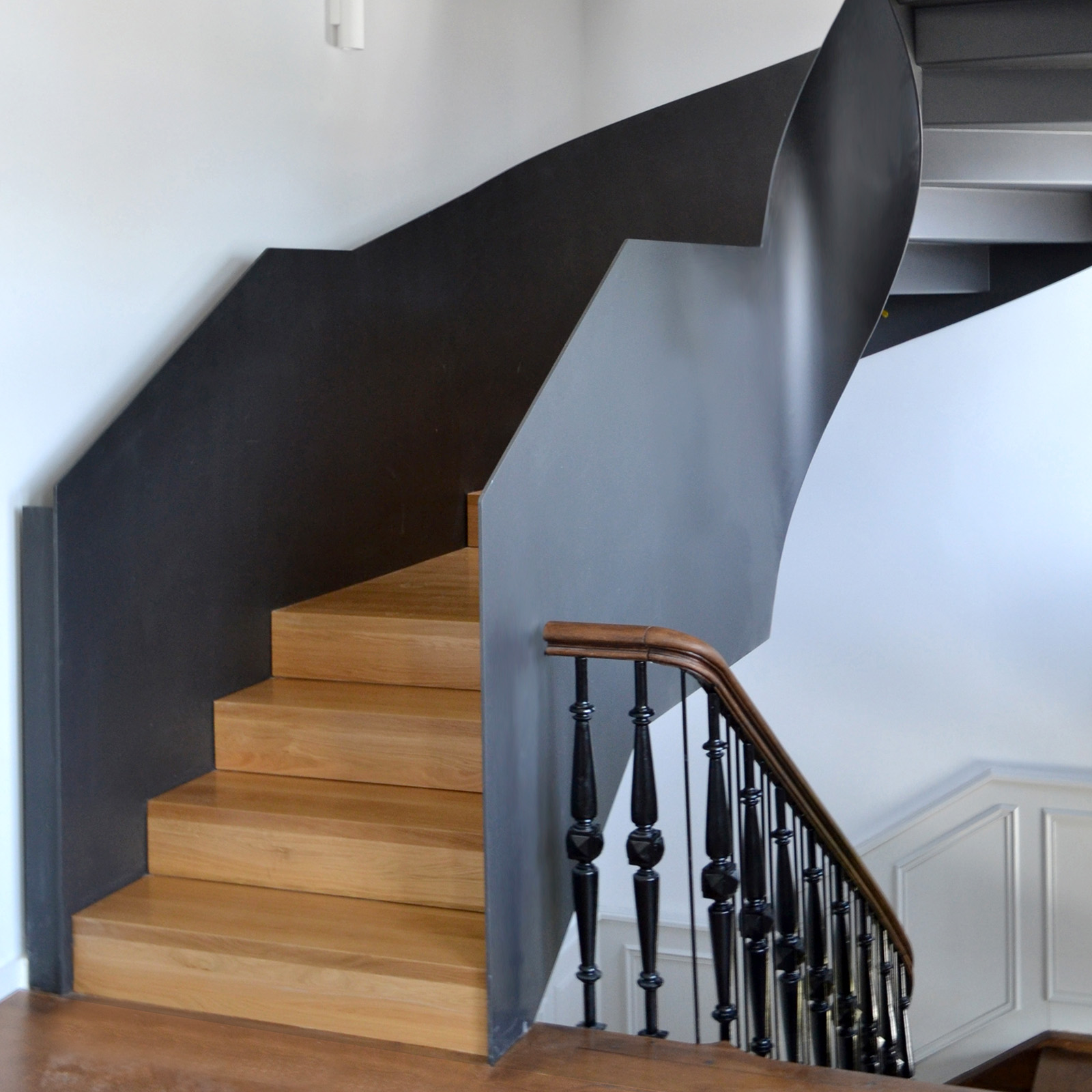 Zweiwangen-Stahltreppe mit gleichmäßig gewendeltem Grundriss und einem Austrittspodest als Steg. Ausführung mit geländerhohen geschlossenen Brüstungen aus Stahlblech und eingeschweißten Stahlblechfaltstufen mit versenktem oberen Blech zur Teppicheinlage. Dazu beidseitig ein Edelstahl-Rohrhandlauf auf Konsolen. Stahlteile lackiert, Edelstahlhandläufe matt geschliffen.