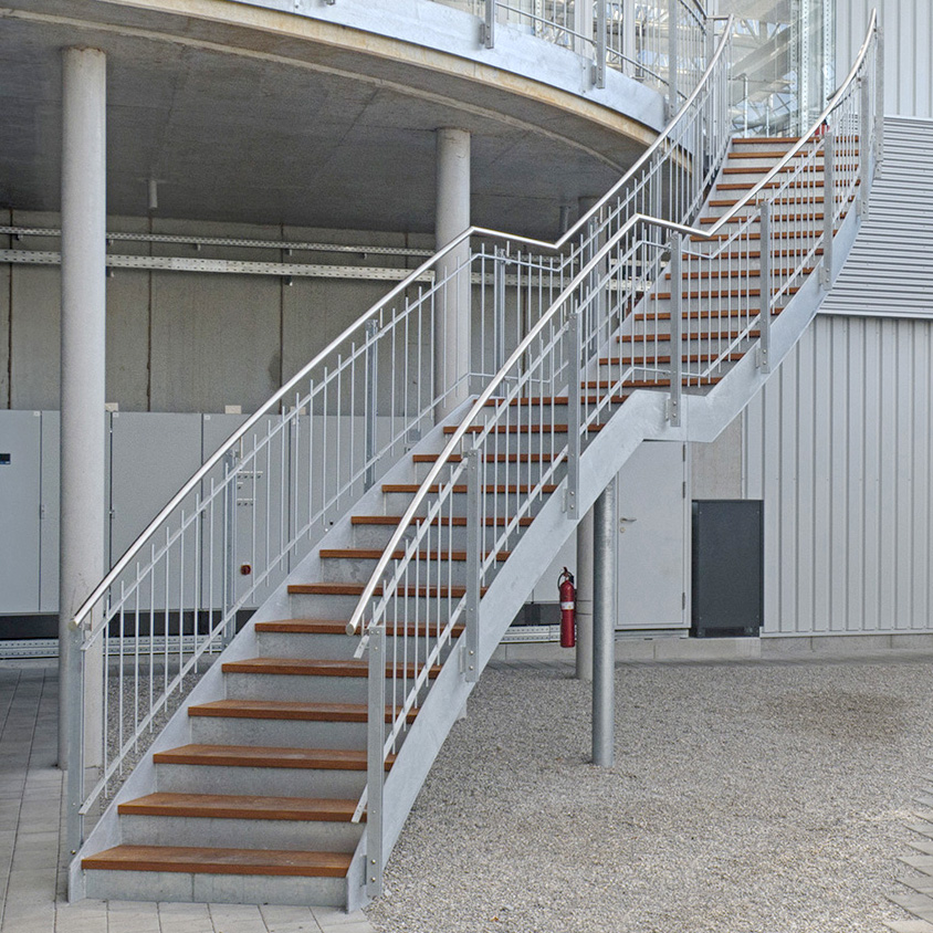 Zweiwangen-Stahltreppe mit gleichmäßig gewendeltem S-förmigen Grundriss mit einem Zwischenpodest mit Stütze aus Stahlrohr und einem Austrittspodest. Zwischen den Wangen verschweißte Stahlblechfaltstufen mit Holztrittbelag aus Eiche mit 2 Rutschsicherheitskanten aus PVC.