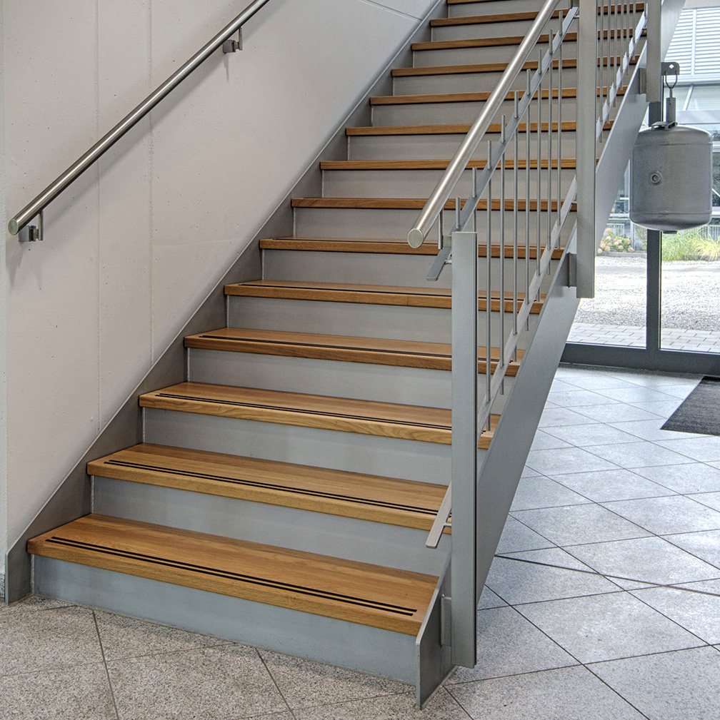 Stufenbelag aus Eiche, 50mm, massiv, blockverleimt mit eingenuteter Edelstahl-Rutschsicherung.