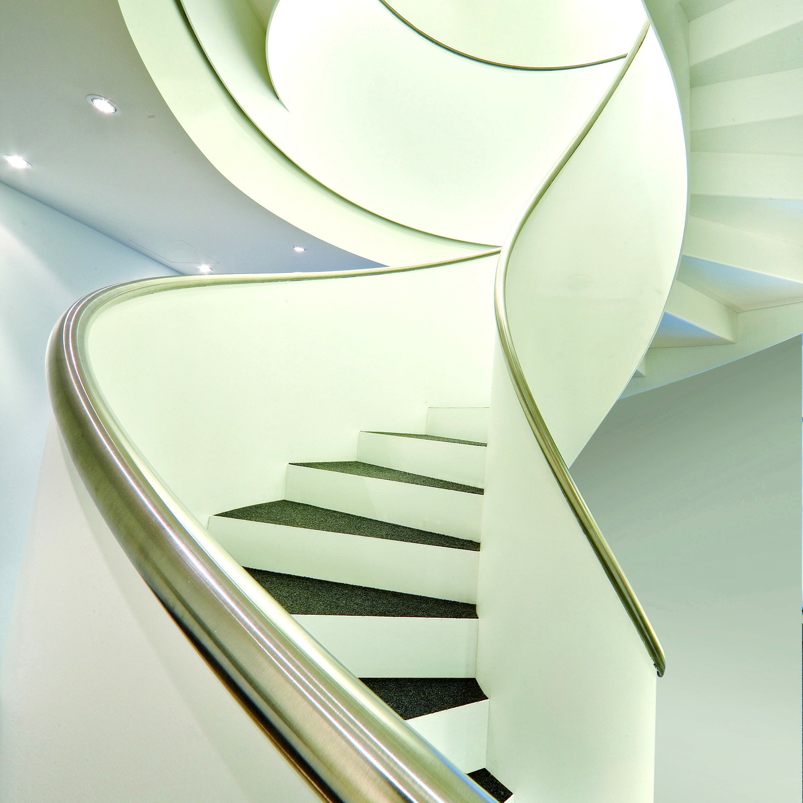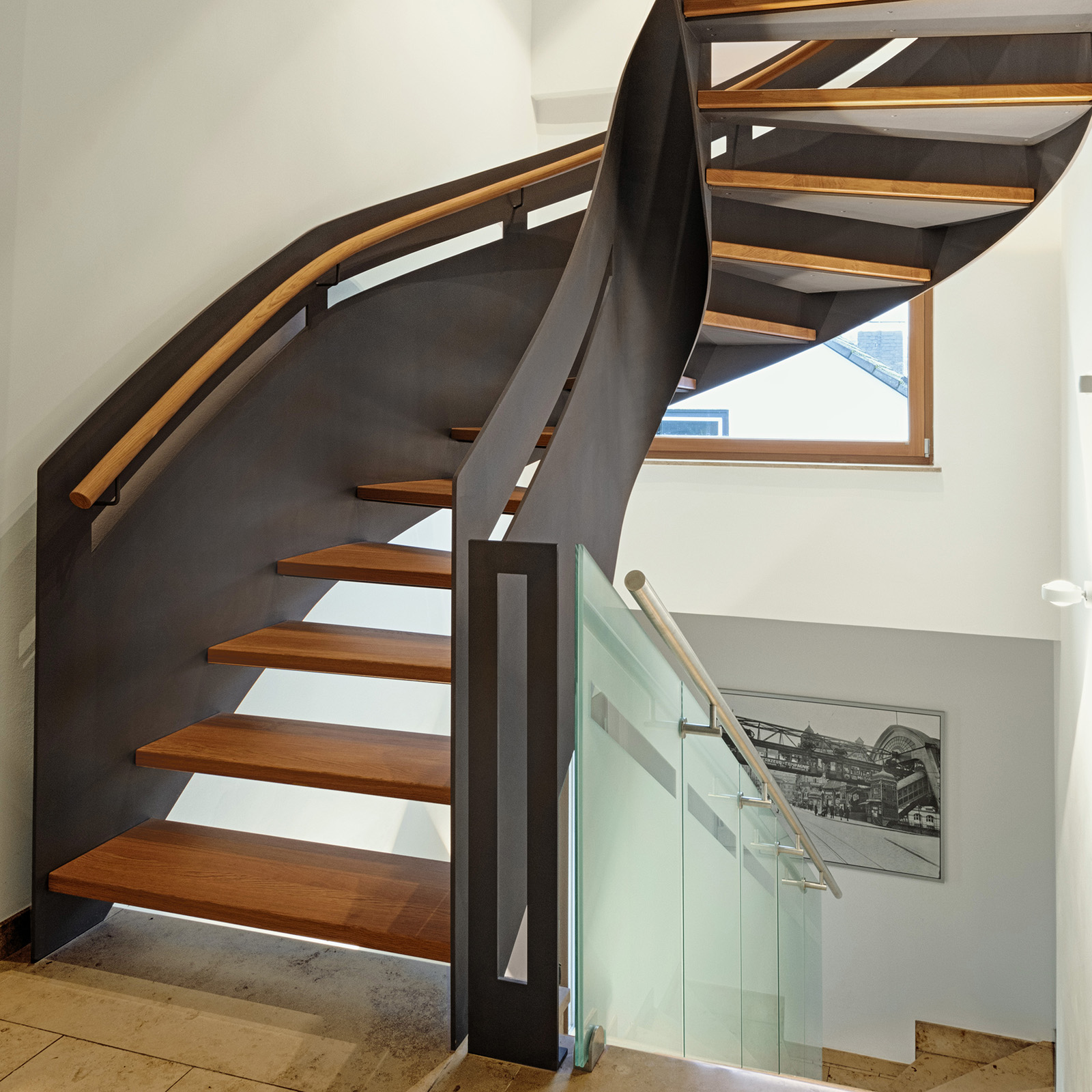 Zweiwangen-Stahltreppe mit gleichmäßig gewendeltem Grundriss und einem Austrittspodest als Steg. Ausführung mit geländerhohen geschlossenen Brüstungen aus Stahlblech und eingeschweißten Stahlkastentritten mit Trittschalldämmung und versenktem oberen Blech zur Teppicheinlage. Dazu beidseitig ein Edelstahl-Rohrhandlauf auf Konsolen. Abschlußgeländer am Deckenrand als Ganzglasgeländer mit oberem Edelstahlabschlußprofil. Stahlteile lackiert, Edelstahlhandläufe matt geschliffen.