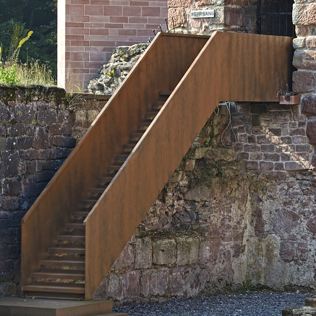 Wangen aus Flachstahl als Brüstung erhöht mit eingeschweißten Faltblechstufen. Trittbelag aus Stein mit Edelstahlantrittskante. Auf den Brüstungen oberseitig ein Edelstahlrohrhandlauf direkt aufgesetzt.