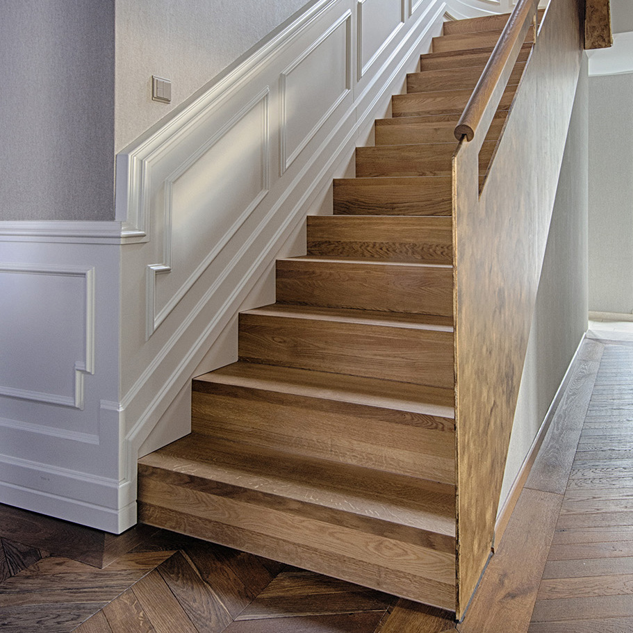 Die Stufenvorderkante verläuft hierbei in der Regel parallel zur Holzmaserung. Die Oberflächen sind geschliffen ggf. gebeizt und matt versiegelt oder geölt/gewachst.