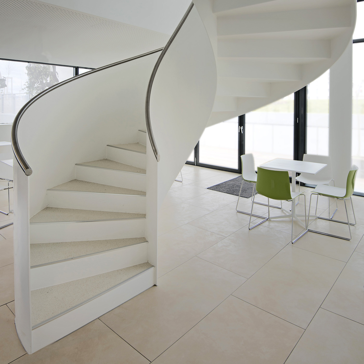 Zweiwangen-Stahltreppe mit gleichmäßig gewendeltem Grundriss und einem Austrittspodest als Steg. Ausführung mit geländerhohen, geschlossenen Brüstungen aus Stahlblech und eingeschweißten Stahlblechfaltstufen mit Ausbildung von Trogstufen für Estrichfüllung und Flieseneinlage. Dazu beidseitig ein Edelstahl-Rohrhandlauf auf Konsolen. Stahlteile lackiert, Edelstahlhandläufe matt geschliffen.