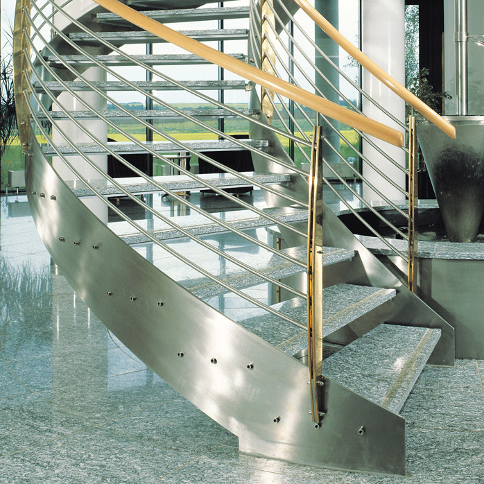 Zweiwangen-Stahltreppe mit gleichmäßig gewendeltem Grundriss über zwei Geschoße mit jeweils einem Austrittspodest an eine Galerie. Ausführung mit geländerhohen, geschlossenen Brüstungen aus Stahlblech und eingeschweißten, versenkten Stahlblechtritten mit eingeklebtem Natursteinbelag. Dazu beidseitig ein Edelstahl-Rohrhandlauf auf Konsolen. Stahlteile lackiert, Edelstahlhandläufe matt geschliffen.